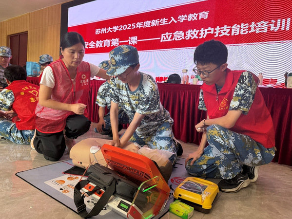 学院2025级全体本科生在存菊堂参加了由苏州市红十字会倪淑娟老师主讲的“应急救护知识培训”。培训涵盖五大应急救护原则(保护自身、防止交叉感染等)、心肺复苏操作(指定人员拨打急救电话取AED→胸外按压:两乳头连线中点,深度5-6厘米,频率100-120次/分钟→仰头举颌法开放气道→人工呼吸2次)、AED使用“三步两离开”原则,以及气道异物梗阻处理(完全梗阻立即CPR,不完全梗阻先鼓励咳嗽,肥胖者/孕妇用胸部冲击,婴幼儿交替叩击与冲击),并通过图像、视频演示操作后果,有效提升新生应急救护知识与实际问题解决能力。