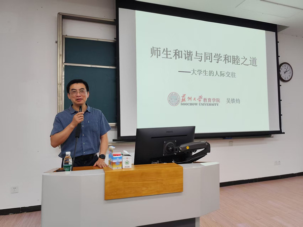 教育学院副院长吴铁钧副教授为我院2025级新生开展了题为“师生和谐与同学和睦之道”的专题讲座。讲座从大学教育目标、宿舍关系、学业进程与情感生活等维度出发,引导同学们理性看待大学生活,逐步调整心理预期。吴教授通过人与动物的对比,阐释了人际交往的社会意义,并引入社会交换理论、公平理论等心理学原理,深入浅出地讲解了人际关系的建立与维系之道。他结合校园生活中的典型实例,剖析了“急于求成”、“自我中心”等常见交往误区,并提出具有操作性的调适方法与沟通策略。讲座还推荐了《社会心理学》(戴维·迈尔斯著)与《当代社会心理学》(阎力著)作为延伸阅读,鼓励同学们系统学习、科学运用。整场讲座内容扎实、案例生动,有效帮助新生掌握人际相处与情绪管理的科学方法,为营造和谐积极的大学生活奠定心理基础。