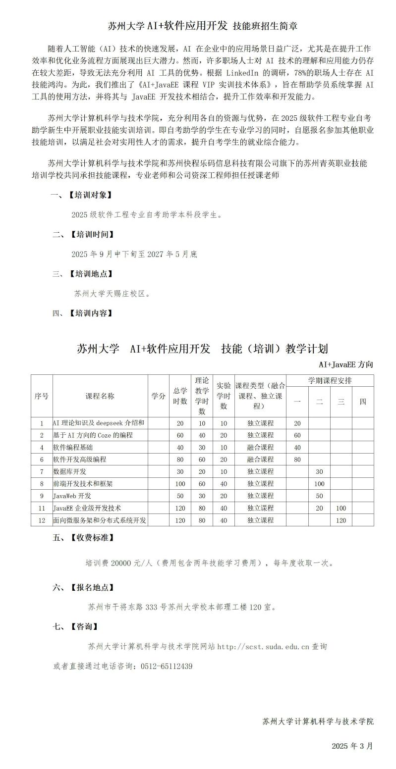 2025年度苏州大学软件工程技能班招生简章