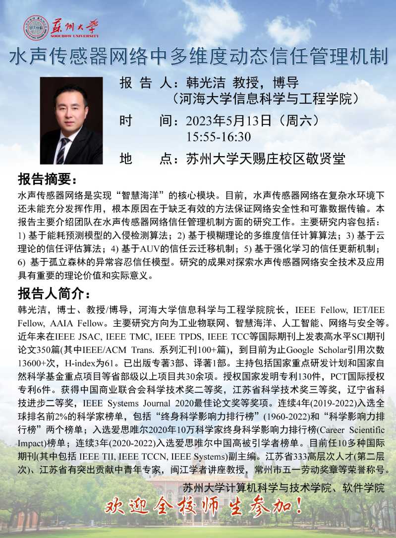 学术报告:水声传感器网络中多维度动态信任管理机制