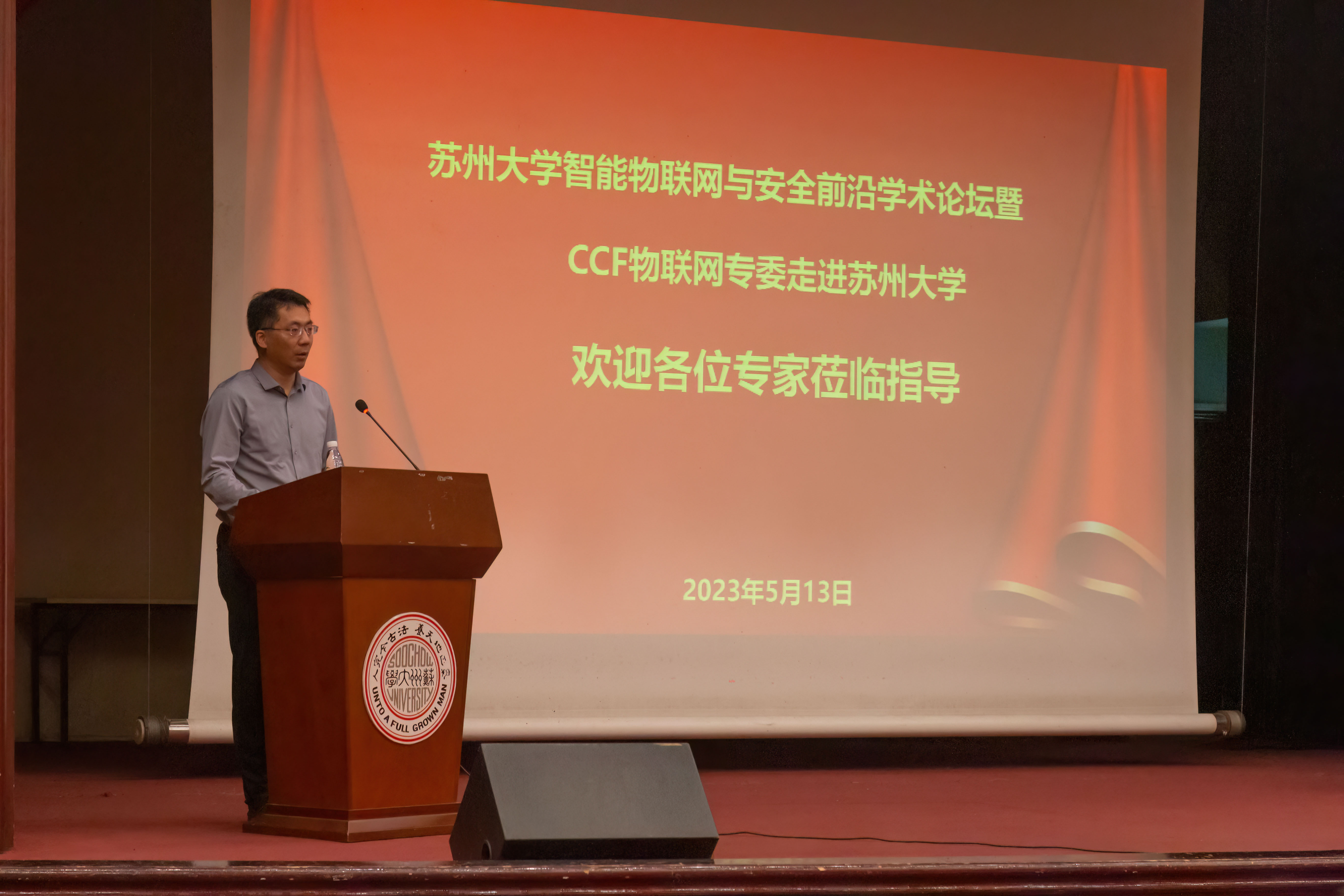 5月13日下午,苏州大学智能物联网与安全前沿学术论坛暨CCF物联网专委走进苏州大学活动在我校天赐庄校区敬贤堂隆重举行。本次活动由中国计算机学会(CCF)主办,CCF物联网专委会、苏州大学计算机科学与技术学院、软件学院承办。苏州大学党委常委、副校长李孝峰,计算机科学与技术学院党委书记胡新华,北京邮电大学计算机学院教授、国家杰青、IEEE Fellow、物联网专委会主任马华东,中科院信工所二级研究员、物联网安全技术北京市重点实验室主任、CCF物联网专委会副主任孙利民,清华大学仪器科学与技术研究所所长、CCF物联网专委会副主任王雪等二十余位我国物联网及信息安全领域的知名学者出席了活动。会议由苏州大学计算机科学与技术学院副院长黄河教授主持。