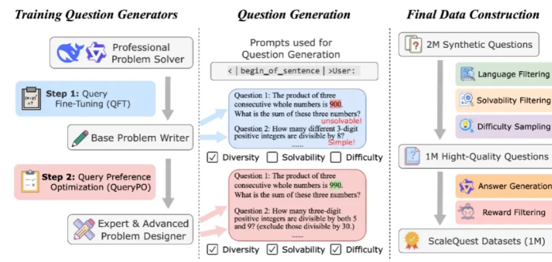 简介:提升大语言模型(LLMs)的数学推理能力是推动人工智能发展的关键。然而获取大规模、多样化且高质量的推理数据集仍是开源社区面临的重大挑战。为此,我们提出ScaleQuest,一种新颖、可扩展的数据合成方法,引入了两阶段的问题调优流程,包括问题微调(QFT)与问题偏好优化(QPO),有效激发模型的问题生成潜力。实验结果表明,使用我们数据训练的模型在领域内与跨领域评估中优于现有开源数据集;随训练数据量增加持续提升,模型的性能持续增长。