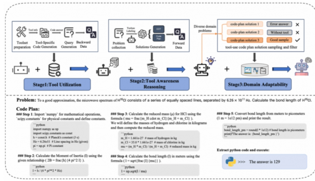 简介:为提升大语言模型(LLMs)在科学推理中的工具使用能力,我们提出了一种三阶段的训练方法——Tool-AwarenessTraining(TAT)。该方法结合前向与反向数据生成策略,强化模型对工具的理解与选择性使用。具体包括:通过反向生成数据构建工具知识;结合多步推理任务提升工具意识;利用大规模多任务领域数据提升模型的适应性。TAT有效融合了工具使用与科学推理能力,在多个数学与科学任务中显著提升了模型的工具使用主动性与执行成功率。