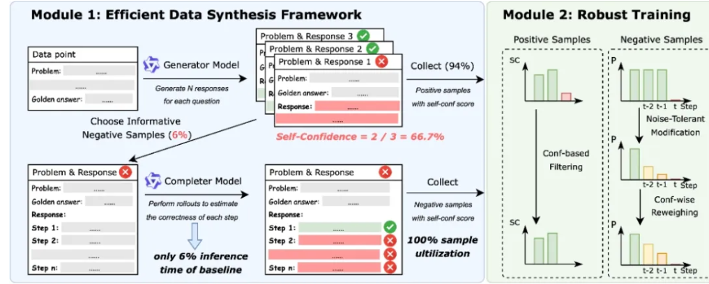 简介:过程奖励模型通过对模型推理过程中的每一步进行细粒度评估,在提升大语言模型(LLMs)复杂任务表现(如数学推理)方面展现出显著效果。然而,PRMs的构建依赖于人工标注数据,这不仅成本高昂,而且难以扩展。尽管基于蒙特卡洛(MonteCarlo,MC)估计生成的合成数据是一种有前景的替代方案,但其存在较高的噪声比例,容易导致模型过拟合,从而限制了大规模训练的效果。本研究对合成数据中的噪声分布进行了系统性的分析,并提出了一种高效的数据合成与抗噪声学习框架。该方法仅利用轻量级模型和极低的训练代价,合成数据的质量超过专家标注数据。