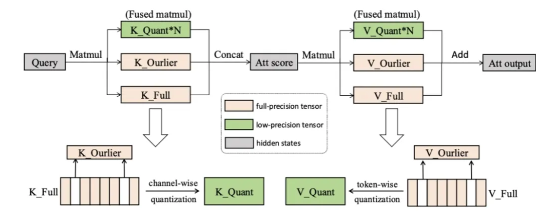 简介:大语言模型(LLM)的强大能力w是以部署期间大量计算资源为代价的。虽然KVCache可以显著减少推理过程中的重新计算,但它也会引入额外的内存开销。KVCache量化提供了一种有前景的解决方案,在内存使用和准确性之间取得了良好的平衡。先前的研究表明,Key是按照Channel分布的,而Value是按照Token分布的。因此,常见的做法是对Key应用Channel-wise量化,对Value应用Token-wise量化。然而,我们的进一步调查表明,一小部分不寻常的令牌表现出偏离这种模式的独特特征,这可能会对量化精度产生重大影响。为了解决这个问题,我们开发了一种简单而有效的方法,在解码过程中准确识别这些令牌,并将其作为异常令牌排除在量化之外,从而显著提高了整体准确性。大量实验表明,我们的方法在2-bit量化下实现了显著的精度提高,可以将内存使用量减少6.4倍,吞吐量增加2.3