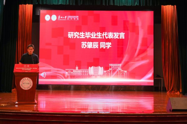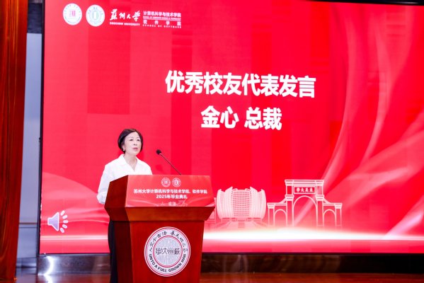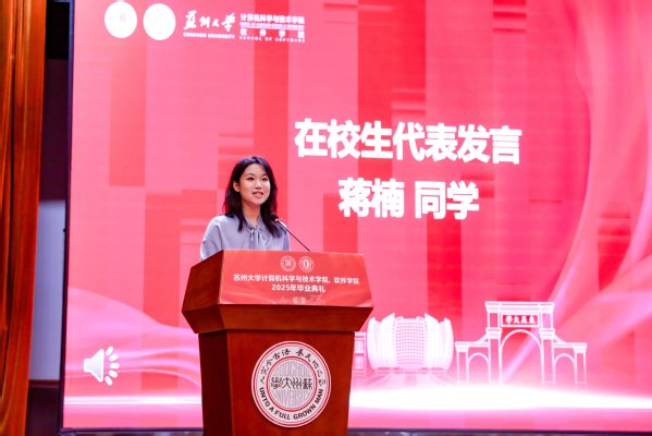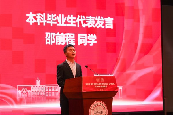 2021级计算机科学与技术专业的邵前程同学作为本科毕业生代表发言,他回顾了从初入校园的青涩到即将走向社会的成熟蜕变,同时表达了对学院和老师悉心培养的感激,并鼓励同学们不忘初心,勇敢迎接未来的挑战。2022级计算机科学与技术专业硕士研究生苏肇辰同学作为研究生毕业生代表发言,他分享了在校期间的学习和科研感悟,并号召同学们铭记“养天地正气、法古今完人”的苏大校训,在未来的工作和生活中继续发挥专业所长,为社会贡献力量。2023级人工智能专业的蒋楠同学作为在校生代表发言,她向即将毕业的学长学姐送上诚挚的祝福,感谢他们的榜样力量,并表示将传承他们留下的“精神代码”,在今后的学习中不断努力,砥砺前行。我院1988级校友金心作为优秀校友代表发言,金心总裁结合自身成长与职业发展的经历,勉励学弟学妹们在新时代的广阔舞台上善于抓住机遇,在不断奋斗中成长为勇担时代使命的有为青年。学院李凡长教授作为教师代表发言,李教授以一个富有创意的数学公式为引,从不确定性、可持续性、复杂性与稳定性四个角度,寄语毕业生们坚定信念、勇敢前行、持续进步、追求平衡。随后,毕业生代表顾斯佳和孙家杨向学院赠予礼物,以此表达对学院辛勤培育的感激之情。