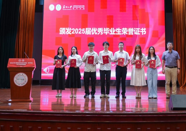 典礼在承载青春记忆的毕业视频中温情开场,课堂的专注、赛场的拼搏、活动的欢笑……一帧帧画面勾勒出难忘的东吴时光。在庄严的国歌声中,毕业典礼正式拉开帷幕。赵雷宣读了本科生考取和推免硕士研究生、硕士生考取博士研究生名单;居民宣读了2025届优秀本科及研究生毕业生名单;俞莉莹宣读了2025届校友联络员名单。院领导为优秀毕业生及校友联络员颁发证书、聘书并合影留念。