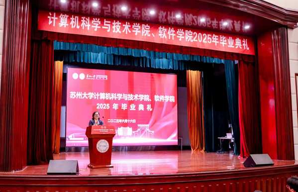 6月16日上午,苏州大学计算机科学与技术学院、软件学院2025年毕业典礼在天赐庄校区敬贤堂隆重举行。计算机科学与技术学院党委书记陈国凤、院长黄河、软件学院常务副院长赵雷、副院长居民、软件学院副院长俞莉莹,以及各系主任和全体辅导员、毕业班班主任、2025届本科生、研究生及毕业生家长代表参加了典礼。典礼由学院党委副书记、副院长李恩秀主持。