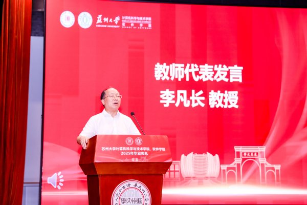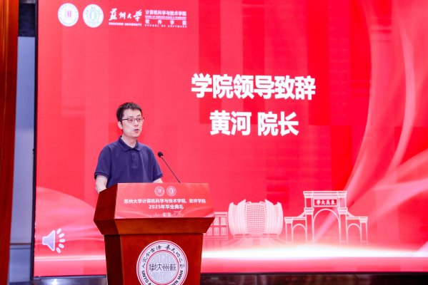最后,学院院长黄河发表讲话,他代表学院全体师生员工向毕业生们表示热烈祝贺。他回顾了同学们在苏州大学的成长经历,充分肯定了大家在科研、学业和实践中的优异表现。他指出,同学们不仅在学术上取得了突出成果,还积极运用专业所学服务国家发展需求,展现了苏大计算机学子的责任与担当。在讲话中,黄院长还引用苏轼《定风波》中的句子,勉励同学们在未来人生道路上,无论面对怎样的挑战与变化,都要保持从容和坚定,始终以平和之心迎接风雨。他鼓励同学们相信梦想的力量、善良的力量与内心的力量,把握人生航向,在数字时代的广阔天地中不断前行,实现自己的价值。此次讲话也为毕业生们上了一堂意义深远的“大思政课”。