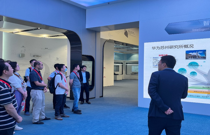 华为苏州研究所的负责人热情接待了苏州大学参与交流的一行领导和专家学者,并陪同参观了展厅。苏研所研发人员向参会老师讲解了智能云网、超融合数据中心网络Cloud Fabric 3.0解决方案、全以太HPC网络等主要产品,介绍了华为技术有限公司在智能网络方面的核心能力。在展厅的“X-Zone”黑科技展厅中,与会老师详细了解了高性能计算芯片、航空级混流风扇、精准性智能信号算法等新产品和新技术,并展开热烈讨论和踊跃体验。