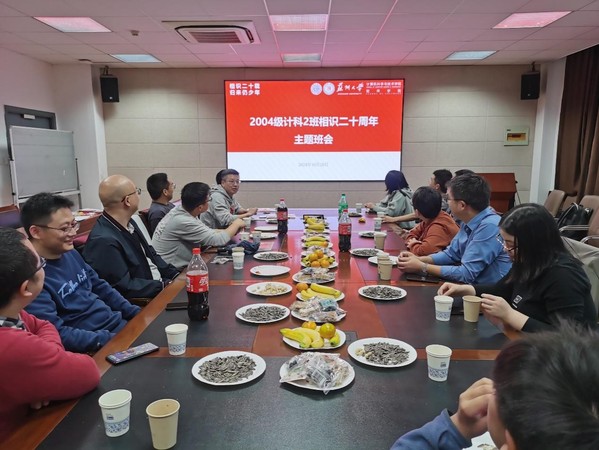 2024年10月26日下午,正值计算机科学与技术学院2004级计科2班入学20周年,校友回到天赐庄校区本部理工楼举行了“相识20年”主题班会活动。软件学院副院长、院校友工作负责人俞莉莹老师、苏州大学招生就业处副处长、2004级计科2班辅导员张芸老师、计算机科学与技术学院(软件学院)院长助理、院工会主席、2004级计科2班班主任朱晓旭老师出席活动。