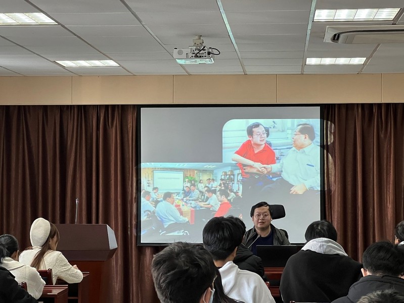 活动中,李麟青博士用一张张照片向我们缓缓叙述他的求学与创业经历,先天残疾仍乐观向上,用坚定自信的人生态度在学业和事业上走出一条光明大道。李麟青博士在求学路上受到太多人的帮助,感受到温暖善意,在创业时也希望回馈社会,他在读期间研发了全景模式的无障碍地图,一直在积极推进残疾人的智能服务体系建设,尽己所能,弘扬人道主义精神,倡导扶残助残良好风尚,通过自己的专业和创业能力,对需要帮助的社会弱势群体给予科技助力。在活动的后程,李博士就自己当前的工作成果和同学们进行了多轮的互动交流,为同学们解答疑惑。