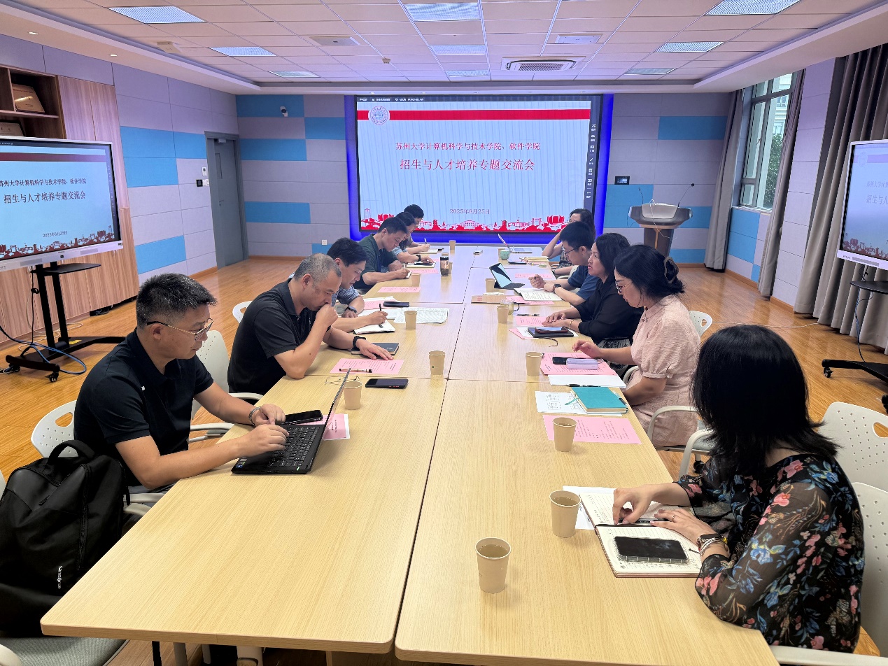 为主动应对新时代对计算机领域拔尖创新人才的迫切需求,深入研讨本科招生与人才培养的战略性、前瞻性议题,谋划学院人才队伍建设高质量发展新路径,2025年8月25日下午,苏州大学计算机科学与技术学院、软件学院在理工楼214会议室召开招生与人才培养专题交流会。会议特邀校招生就业处处长靳葛到会指导。学院党委书记陈国凤,院长黄河,学院班子成员及辅导员共同参会。会议由陈国凤书记主持。