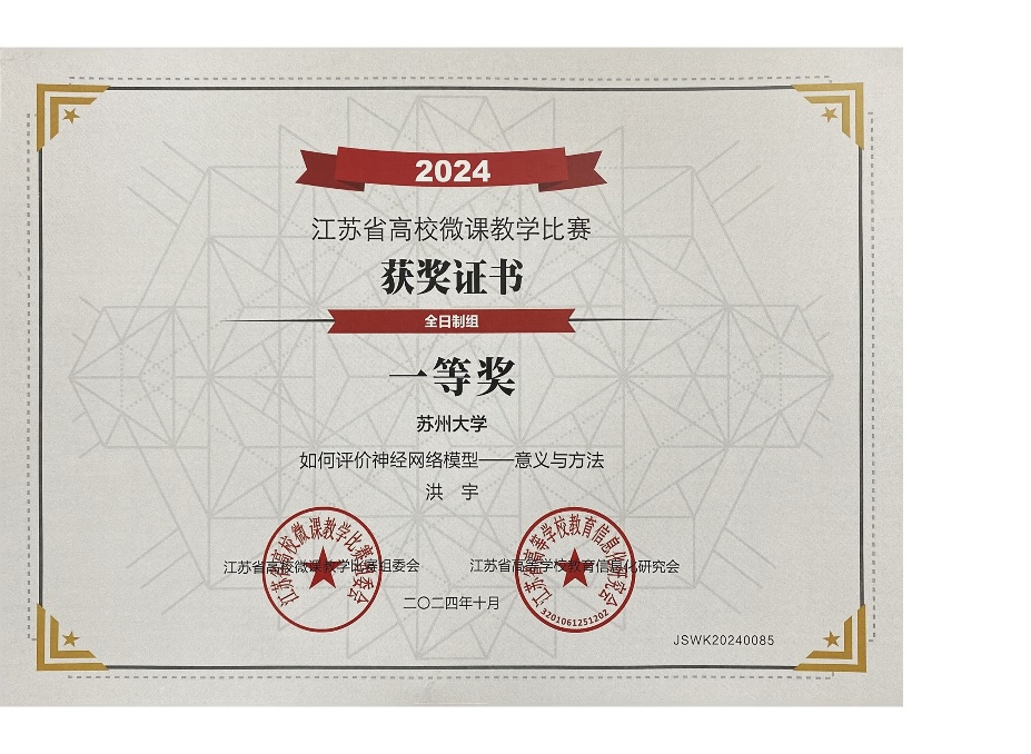 近日,江苏省高等学校教育信息化研究会公布了2024年江苏省高校微课教学比赛的获奖名单,我院洪宇老师的参赛作品《如何评价神经网络模型—意义与方法》荣获一等奖。