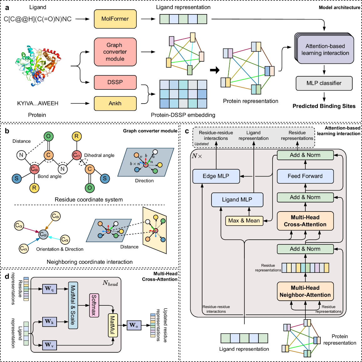论文聚焦于蛋白质-小分子配体结合位点识别这一核心问题,该问题是理解蛋白质功能与药物作用机制的重要环节,对药物发现和蛋白质工程具有关键意义。传统方法往往需针对不同配体分别建模,难以推广至未知配体,泛化能力有限。针对这一挑战,课题组提出了创新模型LABind。该模型基于GraphTransformer捕捉蛋白质局部空间结构中的结合模式,并引入 交叉注意力机制 学习蛋白质与配体之间的特异性相互作用,从而在统一框架下实现多种配体结合位点的高精度预测。实验结果表明,LABind不仅能准确识别训练集中已出现的小分子配体结合位点,在未见配体的预测中也展现出较强的泛化能力;同时,在辅助蛋白质-配体对接任务中提升了构象筛选的效率与准确性,为药物虚拟筛选和功能性蛋白质设计提供了高效的计算工具。