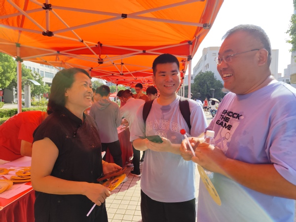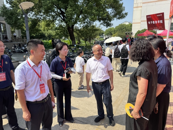其间,校党委常委、副校长姚建林、査佐明专程来到迎新摊位,亲切慰问辛勤忙碌的志愿者们,并走到新生与家长中间,与他们热情交流。“同学从哪里来?”“路上还顺利吗?”“生活上有没有什么不方便?”他们贴心询问着每一个细节,像家人一样关怀着初至苏大的学子,并亲切叮嘱大家“有困难随时找老师”“苏大就是你们的新家”,鼓励同学们安心生活、尽快融入新环境。真挚的问候与细致的关怀,为离家的学子送上了来自苏大的第一份归属感。志愿者的“红”与师者的“蓝”交织在一起,构成了迎新现场最温暖的底色,热情似火,沉稳如海,共同汇聚成计算机学院独特的家文化。