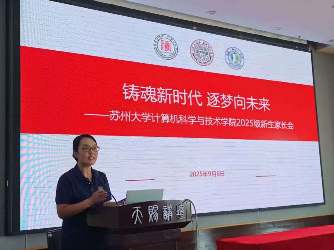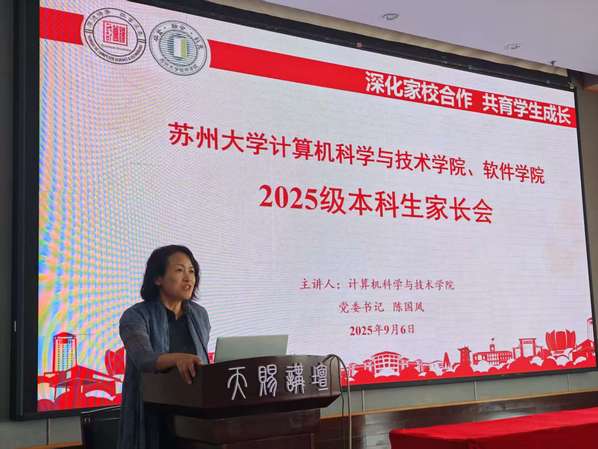 陈书记以近日广受关注的“苏超”赛事为引,巧妙切入,迅速拉近了与家长们的距离。他从苏州独特的区域优势与创新发展讲起,生动介绍了我校深厚的历史底蕴与优良办学传统,并详细阐述了计算机科学与技术学院、软件学院的学科特色、人才培养体系及育人目标。陈书记的报告内容翔实、逻辑清晰,语言既风趣又不失深刻,频频引发现场家长的共鸣与阵阵掌声。