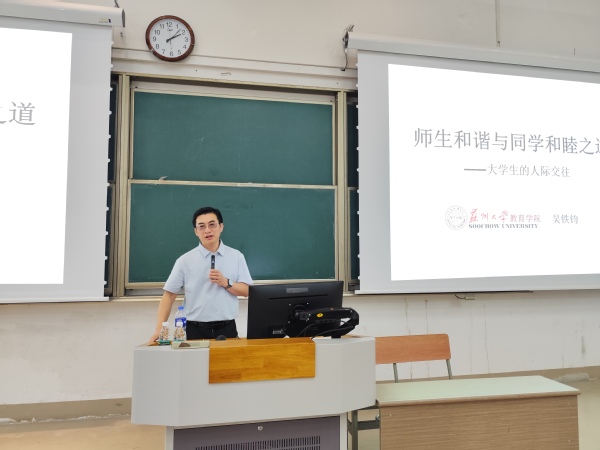 为增强研究生新生的心理适应能力,助力同学们顺利完成从本科到研究生阶段的过渡,9月12日,苏州大学计算机科学与技术学院、软件学院面向2025级全体研究生新生举办了心理健康教育活动。活动特邀苏州大学教育学院副院长吴铁钧副教授作题为“师生和谐与同学和睦之道——大学生的人际交往”的专题讲座。本次活动由学生工作办公室主任高珊主持。
