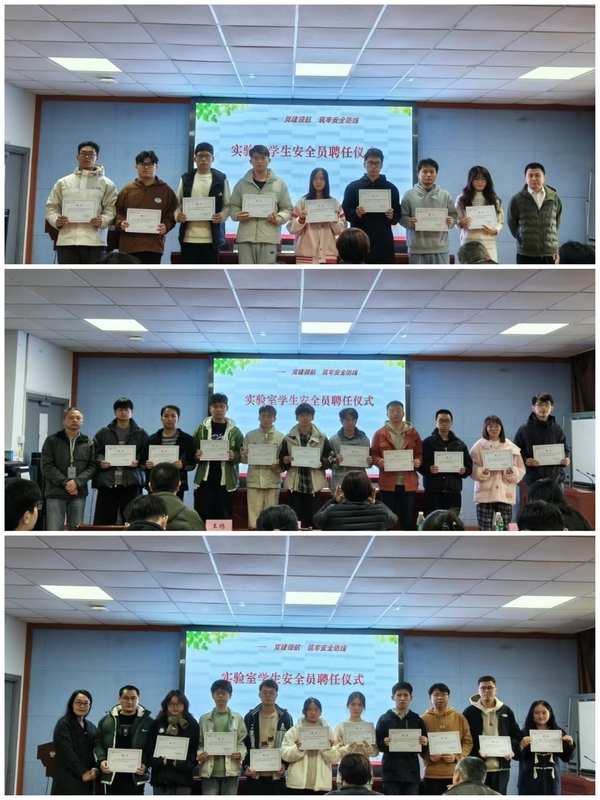 随后,进行了2024-2025学年实验室学生安全员的聘任仪式。聘任的安全员是由研究生党支部推荐和个人申报相结合,共33名学生成功受聘为实验室学生安全员。他们来自院六个研究中心,都是在学业、科研和实践中表现突出的优秀学生。高珊、杨炯、王栋为安全员颁发聘书并赠予安全防护包。安全员们纷纷表示将不负重托,认真履行职责。
