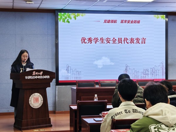 优秀学生安全员代表,2023级研究生付书凡在发言中深切表达了对学院党委信任的感激之情,并强调了实验室安全对学生生命健康的重要性。她分享了过去一年的工作经验心得和典型案例,号召全体安全员携手并进,为实验室的安全稳定贡献力量,同时呼吁全体同学增强规则意识,共同守护实验室的安全环境。