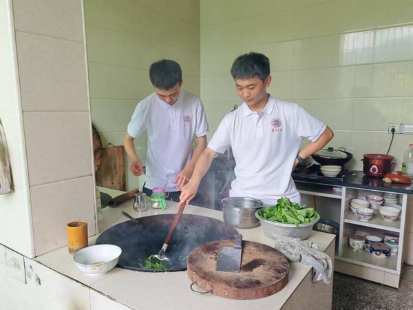 团队成员赵鸿飞(右)和张德嘉(左)在马源村老乡家里做饭