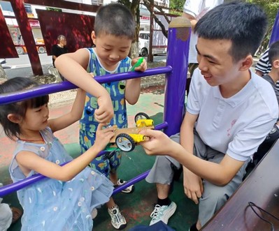 团队成员张德嘉(右一)向社区儿童介绍小车