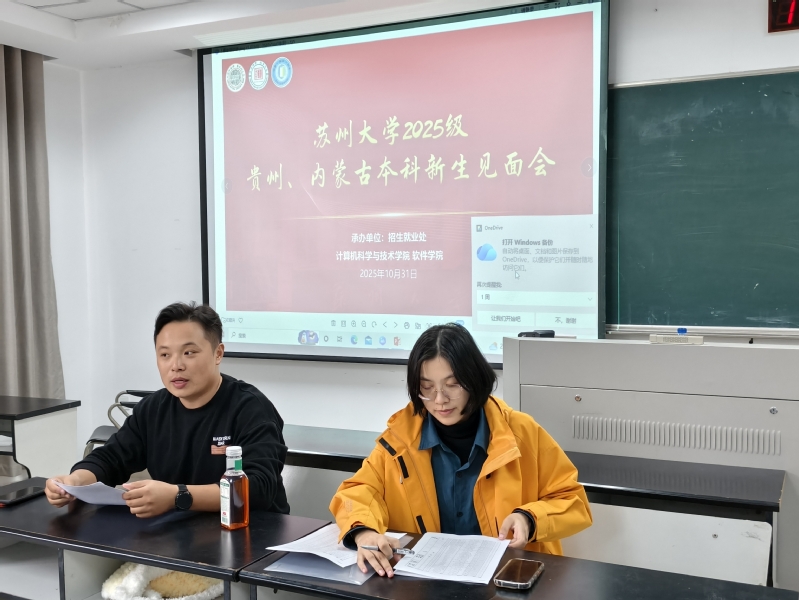 2025年10月31日,由苏州大学招生就业处主办,计算机科学与技术学院、软件学院承办的“苏州大学2025级贵州、内蒙古本科新生见面会”在文成楼206教室温馨举行。本次活动由2022级本科生辅导员王磊、2025级本科生辅导员仇馨玥共同组织,旨在帮助来自贵州和内蒙古的新同学尽快熟悉校园、融入大学新生活。