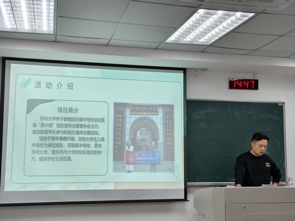 在随后的交流环节中,王磊老师向新生们介绍了“苏小招”招生宣传志愿者协会,并鼓励大家积极参与寒假期间举办的“回访高中母校”活动,通过分享自己在苏大的真实故事,助力更多学子了解苏大、走近苏大。