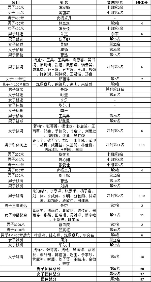 最终,在本届运动会中,我院多项比赛项目取得突破性的优异成绩,荣获优秀组织奖、男女团体总分第七名、男子团体总分第六名。各奖项包括:跳绳团体男子第二名、跳绳团体女子第四名、拔河男子团体第五名、拔河女子团体第五名、女子110米栏第七名(邢丽瑶)、男子800米第五名(沈杨卓凡)、男子三级跳远第七名(朱杰)、男子3000米第七名(曹国庆)、男子400米第五名(林卓滨)、男子跳远第三名(朱杰)、男子4*400米第六名。