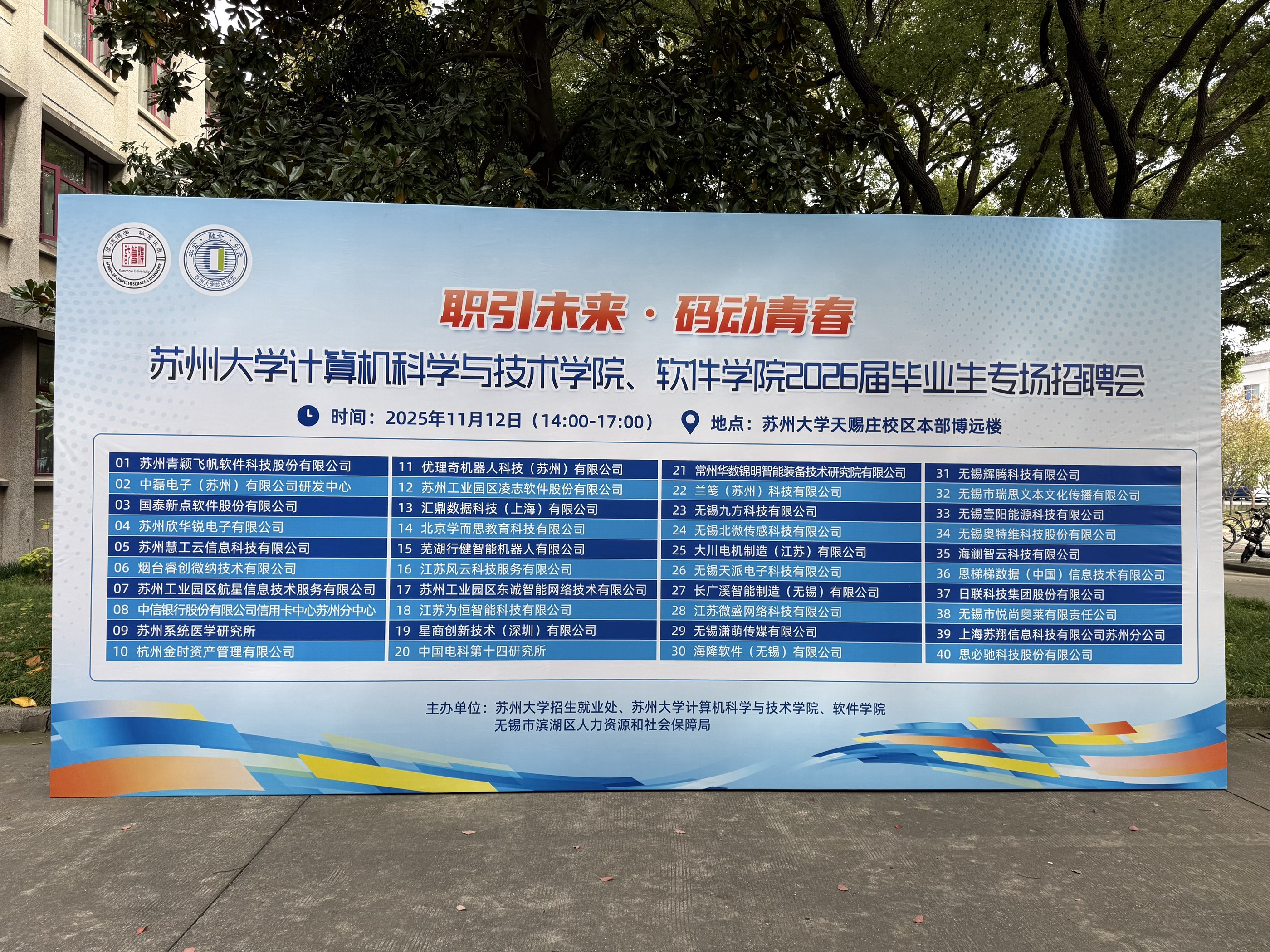 为搭建高校毕业生与用人单位精准对接平台,推动2026届计算机相关专业毕业生高质量充分就业,2025年11月12日,由苏州大学招生就业处,计算机科学与技术学院、软件学院,无锡市滨湖区人力资源和社会保障局联合主办的2026届毕业生专场招聘会,在苏州大学天赐庄校区博远楼一楼成功举办。本次活动同步联动无锡市 “百企千才高校行”暨“智汇滨湖 青睐湖湾”专项计划,共计40家优质企业参与,有效打通校企人才供需对接 “最后一公里”。