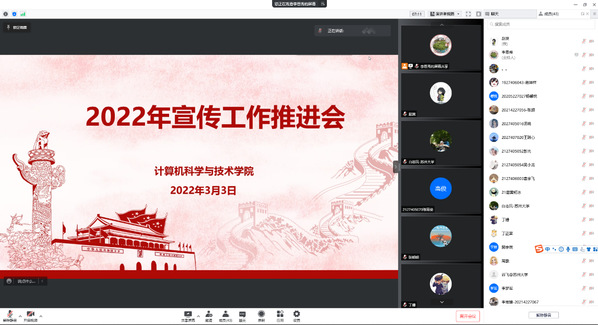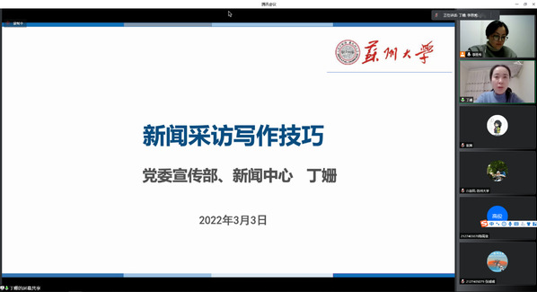 为了加强学院宣传工作队伍建设,提高新闻宣传的质量和实效,进一步提升我院社会知名度、美誉度,树立学院良好形象,3月3日晚,我院2022年宣传工作推进会在线召开。党委宣传部、新闻与网络信息办公室副主任丁姗,学院党委副书记、副院长李恩秀,各办公室、系科、党支部宣传委员、全体辅导员以及学生组织、新闻中心等一批学院宣传队伍的同志参加了会议。会议由李恩秀主持。