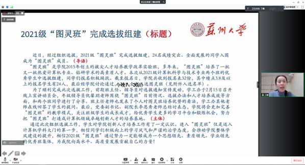 推进会的第一阶段邀请丁姗主任以“新闻采访写作技巧”为主题,进行了培训。她结合自身的新闻采访的写作经历,从“什么是新闻、如何做好高校新闻宣传和新闻稿件如何采写三个方面”进行了全面、系统地讲解分析。层层递进,娓娓道来,引领大家走近新媒体,了解新闻工作者必备的能力和学院层面新闻人的工作核心要点。期间,她以我院“2021级‘图灵班’选拔组建工作顺利完成”新闻稿为例,从标题、导语、主体三部分进行分析与修改,文稿质量提升显著,让大家进一步认识到新闻稿写作方法的重要性。