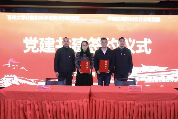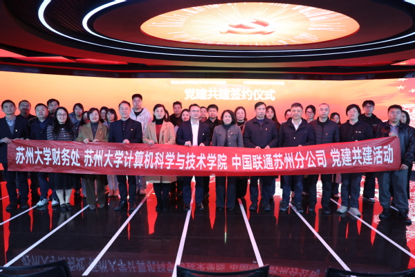为深入贯彻落实党的二十届四中全会精神,积极构建“党建统领、服务师生、聚焦主业、协同创新”的党建工作新格局,11月19日下午,苏州大学计算机科学与技术学院与中国联合网络通信有限公司苏州市分公司隆重举行党建结对共建暨战略合作签约活动。苏州联通党委书记、总经理穆世军,苏州联通党委委员、纪检组长梅光玉,苏州联通党委委员、副总经理戴永康,计算机科学与技术学院党委书记陈国凤,副院长、软件学院常务副院长赵雷,党委副书记、副院长高珊等出席活动。