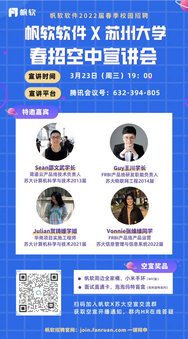 观看线上宣讲直播,赢取直通面试Pass卡,HR&学长学姐现场答疑,帆软精美周边礼品随机掉落!