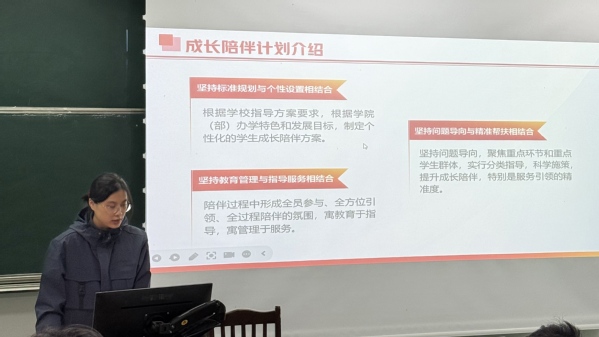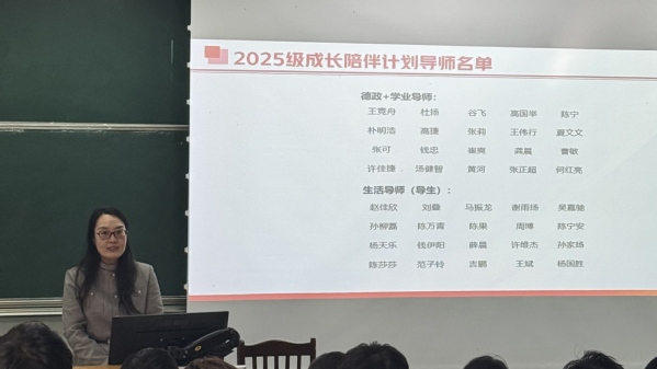 最后,仇馨玥详细介绍了学院成长陪伴计划的发展历程、核心原则与特色举措。该计划自2021年启动以来,通过红色教育、学业分享、文体实践、科研启蒙等多元活动,累计服务数届本科生,学院曾获校成长陪伴工作优秀组织奖。针对2025级新生,学院将持续深化育人模式,推动导师深入学生生活,实现全时保障、全员覆盖,帮助新生更快适应大学生活,成长为适应人工智能时代要求的卓越人才。