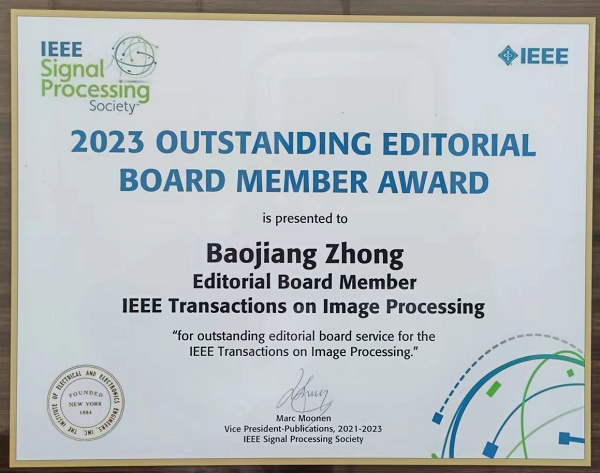 我院钟宝江教授近日被IEEE信号处理学会授予 “2023年度杰出编委奖”(OUTSTANDING EDITORIAL BOARD MEMBER AWARD),以表彰其为《IEEE图像处理汇刊》提供出色的编委服务。IEEE图像处理汇刊(IEEE Transactions on Image Processing)是中国计算机学会推荐的A类学术期刊,在图像处理领域的学术影响力排名第一,最新SCI影响因子为10.4. 钟宝江教授自2022年起担任该期刊的AssociateEditor,负责处理图像特征提取、图像复原、基于深度学习的图像处理方法等研究方向上的稿件。