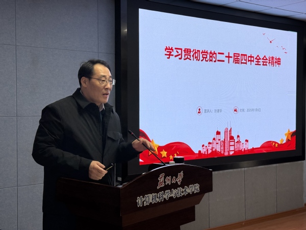 为深入学习贯彻党的创新理论,推动党建与事业发展深度融合,探索新时代校企协同育人新范式,1月6日上午,由苏州大学,中国农业银行苏州分行联合设立的 “金穗讲堂”启动仪式暨学习贯彻党的二十届四中全会精神辅导会在天赐庄校区理工楼504会议室举行。中国农业银行苏州分行党委委员、纪委书记冷冀携分行科技与产品管理部党支部委员代表,苏州大学马克思主义学院院长孙建华,政治与公共管理学院党委副书记、副院长李恩秀,计算机科学与技术学院党委书记陈国凤,院长黄河,副院长居民,专职组织员王栋等出席活动。仪式由学院党委副书记、副院长高珊主持。