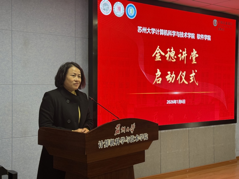 启动仪式上,陈国凤首先致欢迎辞。她深情回顾了学院与中国农业银行苏州分行在以党建为引领下,从启动战略合作到共建“行动党支部”的深厚渊源与扎实成果。陈国凤指出,“金穗讲堂”的创立,是双方将党建引领的政治优势转化为协同发展效能的关键举措,标志着校企合作进入了“资源共享、平台共建、人才共育、成果共享”的常态化、机制化新阶段。未来,讲堂将聚焦理想信念教育、干部培训与专业能力提升等方面,致力于努力建设成为凝聚共识、启迪智慧、赋能发展的思想高地与实践平台,为培养兼具家国情怀、全球视野与卓越创新能力的计算机领域拔尖人才注入强劲动力。