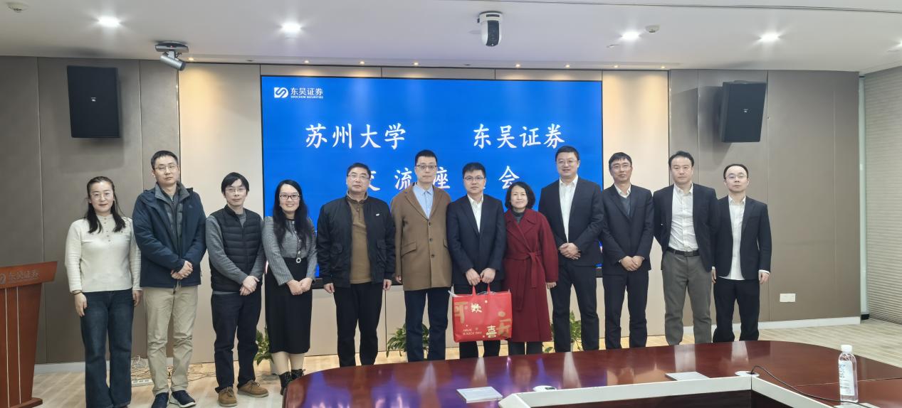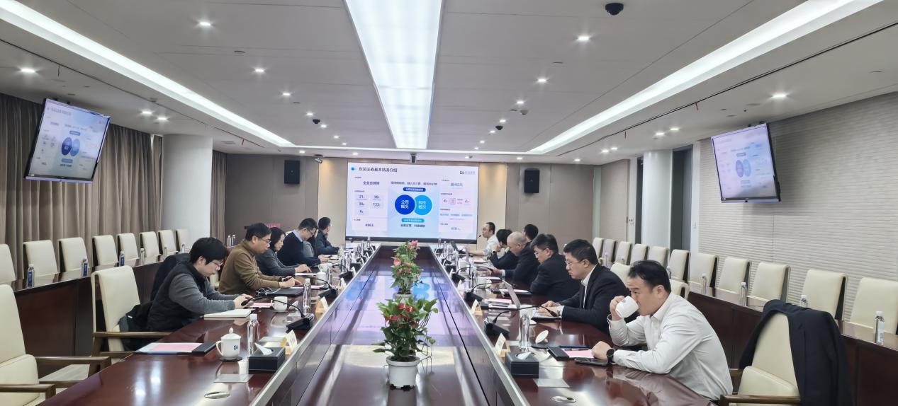 在东吴证券股份有限公司,学院团队受到了党委委员、副总裁高海明,首席信息官华仁杰等高管的热情接待。高海明向学院一行系统介绍了东吴证券近年来的整体发展态势、行业地位与战略布局,特别强调了公司在稳健经营与创新发展方面取得的显著成绩。华仁杰则具体分享了公司在数字金融领域的技术突破、信息化建设成果以及未来IT人才的需求规划。随后,黄河介绍了学院在学科建设、科研方向及一体化人才培养体系方面的优势与特色。双方围绕联合科研攻关、共建实践平台、促进学生实习与就业等方向进行了务实交流,并达成多项共识。