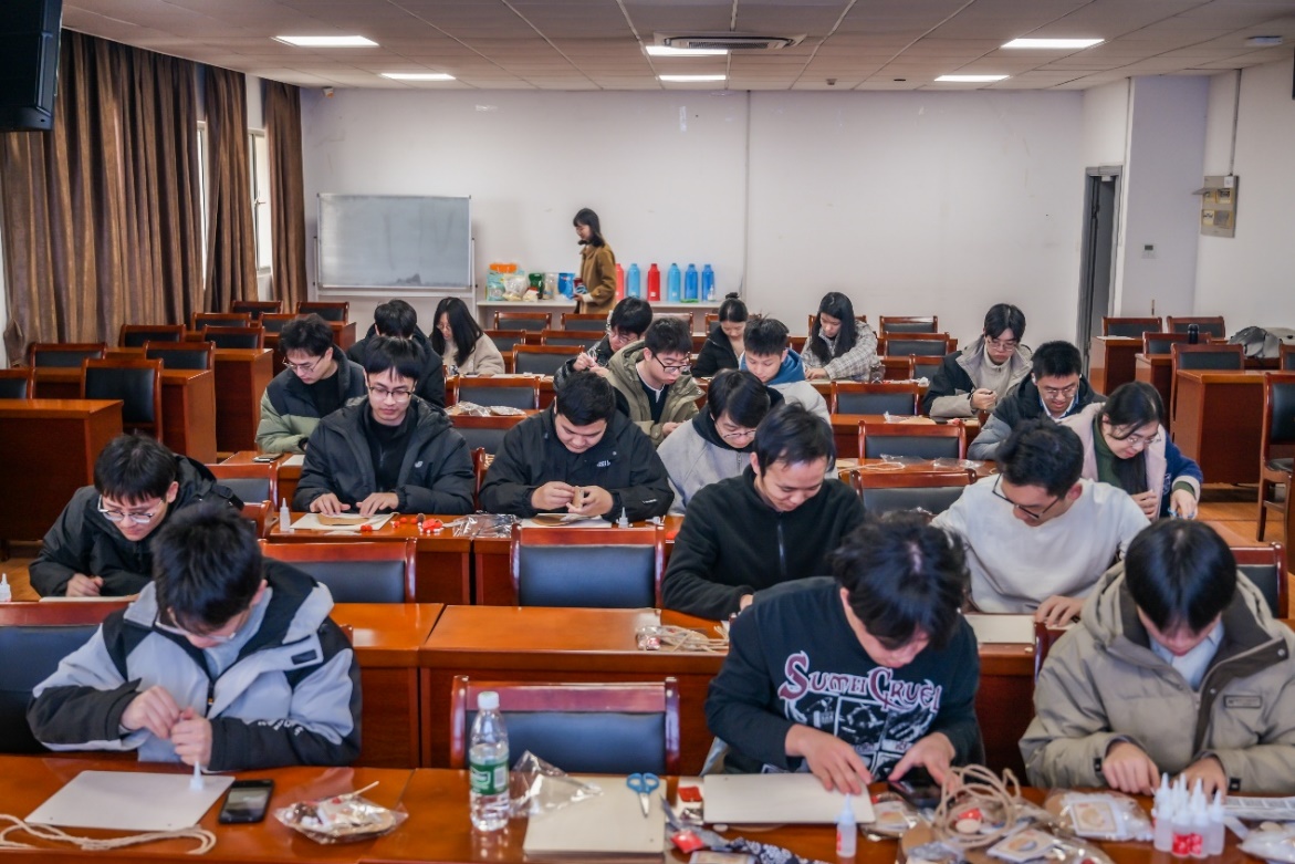 冬至当日,理工楼内暖意融融。参与同学如约而至,有序签到并领取手工材料包。在工作人员指导下,大家开启冬日主题挂件的创作之旅。通过裁剪、拼接、装饰……每一道工序都倾注巧思,简单的材料在指尖蜕变为造型别致、饱含冬日韵味的精美挂件。制作过程中,同学们交流技巧、分享创意,欢声笑语驱散了冬日的寒意,温馨的氛围在室内流淌。