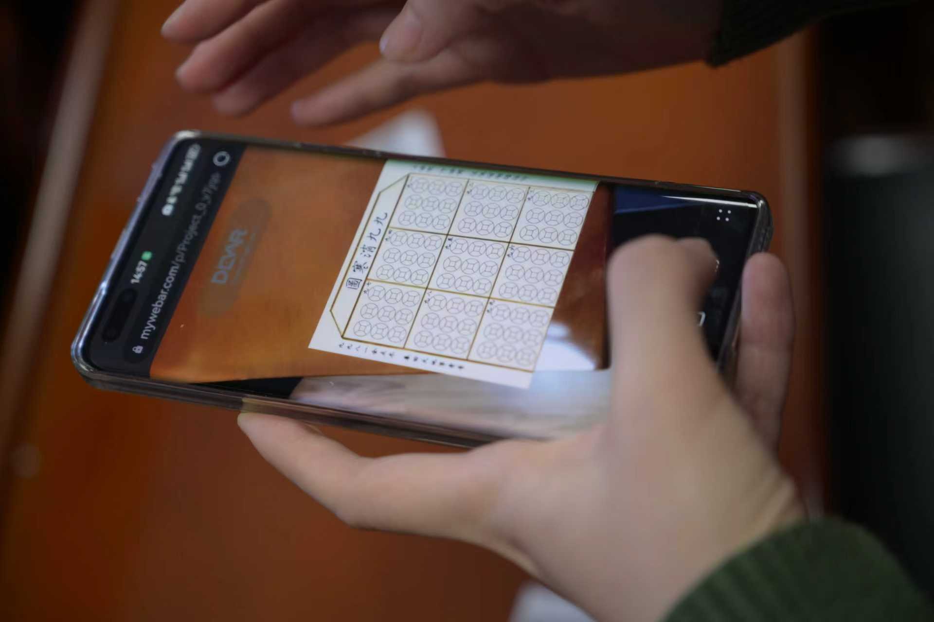 沉浸式手作体验让同学们感受到传统工艺的温度,而AR互动环节则将活动推向高潮,成为科技赋能传统文化的生动注脚。完成手工后,同学们在技术组协助下,用手机扫描挂件上的AR识别码,一幅动态数九图随即跃然屏上。随着识别成功的提示音,传统“数九寒天”文化以生动直观的方式呈现眼前,让参与者在科技加持下,更深刻地体悟冬至的文化内涵。