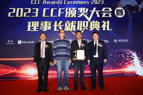 CCF卓越服务奖授予为CCF连续服务十年以上并有重要贡献的会员。2023年“CCF卓越服务奖”获得者为苏州大学计算机科学与技术学院的朱巧明教授。阿里妈妈赞助了该奖项,CCF理事长梅宏教授、奖励委员会主席廖湘科教授和阿里妈妈算法技术总监王亮博士为获奖者颁奖。