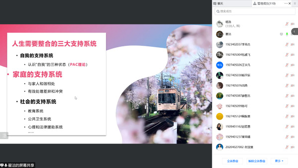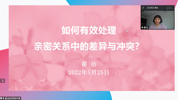 翟洁老师以“如何有效处理亲密关系中的差异与冲突”为题,围绕“疫情期间的亲密关系”,结合生动丰富的案例,从自我、家庭、社会三大人生需要整合的支持系统分享了“活在爱中的秘诀”。她指出,爱自己也是亲密关系中的重要组成部分,疫情期间居家学习生活状态的改变也给了我们重新审视与自己、家人、朋友等亲密关系的机会。
