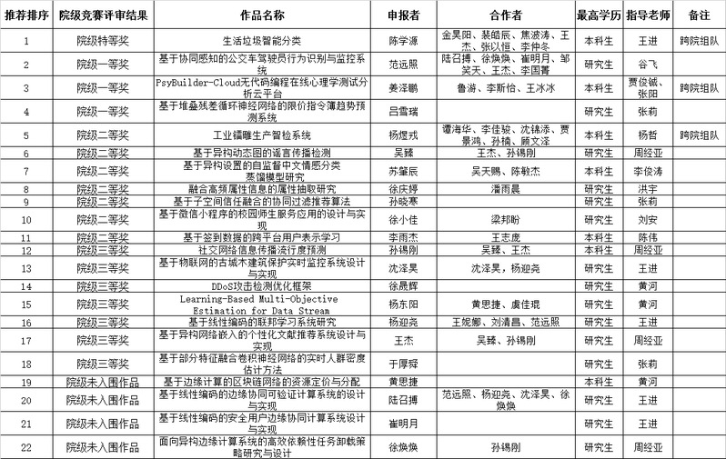 第十二届“挑战杯”苏州大学大学生创业计划竞赛计算机科学与技术学院选拔赛经宣传报名、初赛评比、项目孵化、决赛评审等环节,共产生院级特等奖1项、一等奖3项、二等奖7项、三等奖7项。现公示如下: