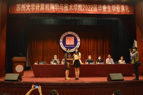 院研究生会主席吕垚作为研究生毕业生代表发言,她表示在苏大本硕的七年光阴,有太多的不舍,感谢苏大这所百年名校和蓬勃发展的计算机学院把各位同学从青涩懵懂的少年,培养成独立思考、自强不息的青年才俊。她希望在未来的日子里,同学们能不负学校的厚望,成为有梦想、有冲劲,勇于实践、敢于担当的新时代青年!