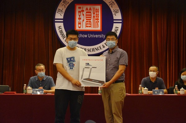 华玥莹和陆宇星代表2022届毕业生与母院互赠礼品,学院赠送每位毕业生一枚定制的专属印章,希望同学们秉承苏大校训,一帆风顺,前程似锦!同学们赠送给学院一台跑步机,希望老师们能够在工作之余加强锻炼,身体康健。