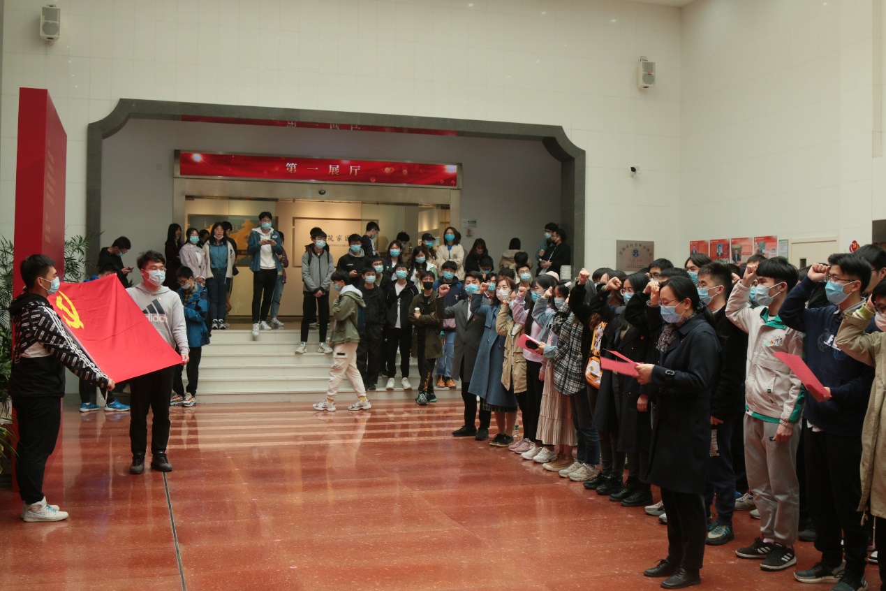 沈云彩带领全体党员一起重温入党誓词,面对着鲜艳的党旗,同学们气势高昂地喊出庄严而铿锵有力的誓词,表达了对祖国的热爱和对党的忠诚,庄严而坚定的宣誓声响彻博物馆大厅。