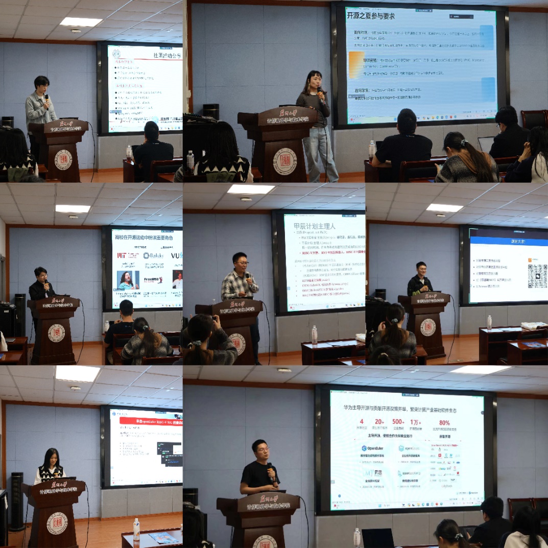 随后,计算机爱好者协会运营部部长、开放原子开源学生俱乐部代表任航介绍了社团在校内组织各类开源活动的情况。开源之夏运营负责人李梦做开源之夏活动介绍,总结了开源之夏的五年历程以及学生参与开源之夏的经验和建议。开放原子开源基金会李明康分享了高校在开源运动中扮演的角色和开源教育的重要意义,介绍了国内开源教育案例。openEuler&openGauss社区运营经理梅相如介绍了开源操作系统openEuler和开源关系型数据库openGauss,并与同学们分享参与社区贡献的流程以及开源之夏项目任务。墨客社区创始人沈达分享了自己十一年的开源之旅,介绍了墨客理工套件的由来和应用等。中国科学院软件研究所工程师 & openEuler RISC-V 测试团队负责人吴洁介绍了openEuler RISC-V SIG的发展历程、测试相关工作成果以及目前开放的参与方式等。中国科学院软件研究所PLCT实验室项目总监RISC-V Ambassador吴伟以开源软件作为承载全人类知识的基础设施为题展开了分享。
