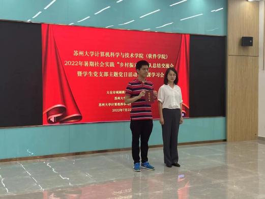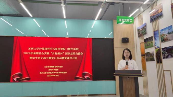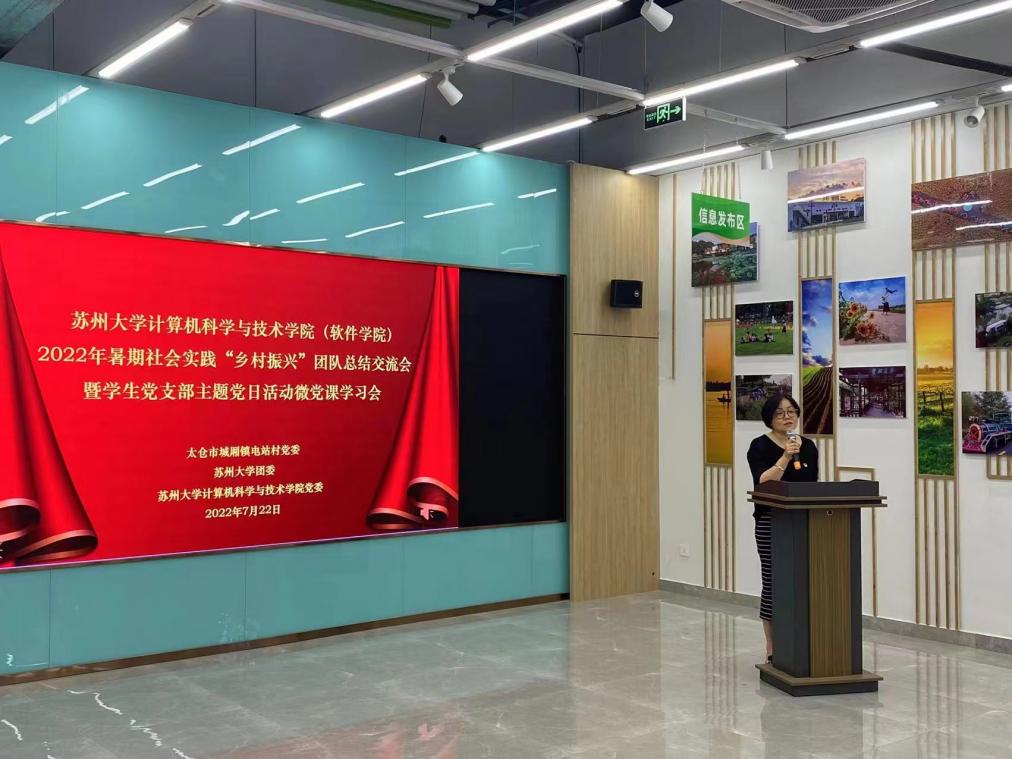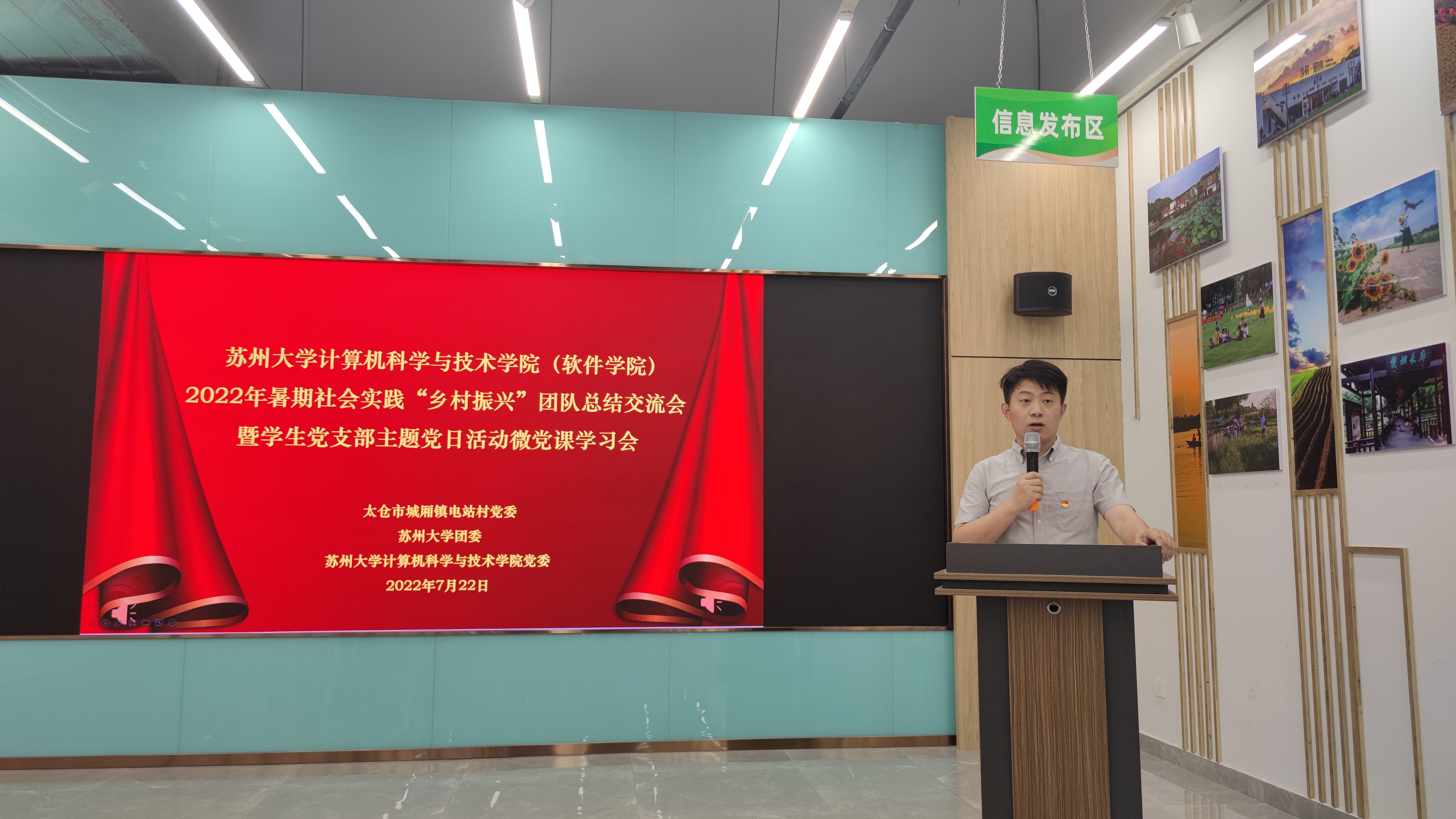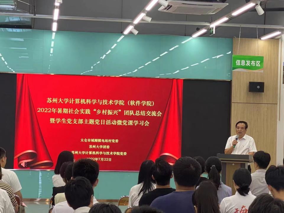 7月22日上午,苏州大学计算机科学与技术学院(软件学院)2022年度大学生暑期社会实践“乡村振兴”团队总结交流会在太仓市城厢镇电站村村史馆举行。校团委副书记严韵致,学院党委副书记、副院长李恩秀,太仓市城厢镇电站村党委书记王义平出席会议。会议由江苏省委组织部选派驻电站村第一书记徐超主持。