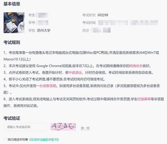 5.点击“开始考试”按钮。即可进入“考试页面”。核对“基本信息”,阅读“考试规则”,填入验证码后即可开始考试。若未在倒计时结束前提交试卷,系统会为其自动提交试卷。